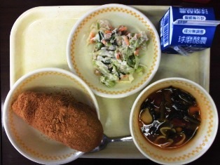 豚キムチごはん 牛乳 わかめと卵のスープ 中華風コーンサラダ ジューシー