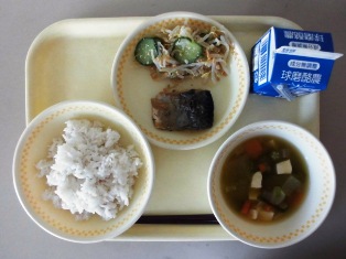 麦ごはん 牛乳 夏野菜ののっぺい汁 さばのみそ煮 ピーナッツあえ