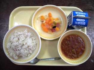 麦ごはん 牛乳 ハヤシシチュー フルーツみつ豆