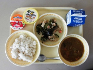 7月生まれのみなさん、お誕生日おめでとうございます。今月は、自分たちで選んだデザートでお祝いします。第1回目のセレクトメニューは、アセロラゼリーとパインムースでした。より多くの津奈木町の子どもたちが選んだのは「パインムース」でした。自分たちで選んだデザートはいかがですか?そして、今日のカレーはいつものカレーと少し違います。夏野菜である「かぼちゃ・なす・えだまめ」を入れました。今月のお誕生日給食もしっかりと味わってくださいね。
