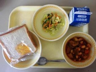 食パン 牛乳 大豆とひき肉のトマト煮 アーモンドサラダ りんごジャム