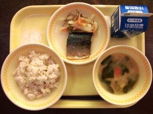 麦ごはん 牛乳 里芋とわかめのみそ汁 鯖の塩焼き 大根と昆布の甘酢あえ