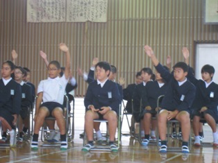 5年生がシナリオなしに、与えられたテーマに対して意見を述べていく様子を披露しました。
