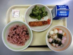 赤飯(ごま塩) 牛乳 紅白すまし汁 えびフライ ブロッコリーのごまあえ