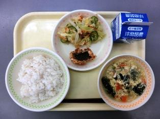 麦ごはん 牛乳 かきたま汁 はものからあげ 五分漬けの和え物