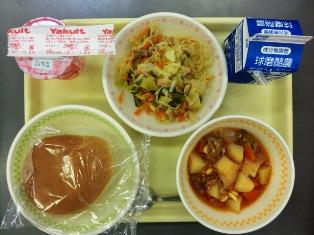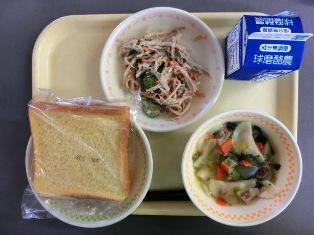 米粉パン 牛乳 大豆とひき肉のトマト煮 切干大根のソテー ヨーグルト