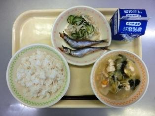 麦ごはん 牛乳 キャベツのみそ汁 焼きししゃも カミカミするめあえ