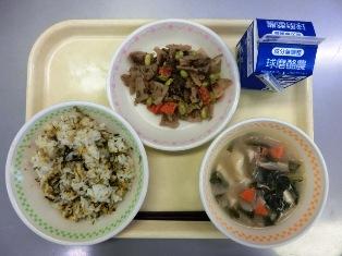 高菜ごはん 牛乳 だんご汁 牛肉とれんこんの炒め物