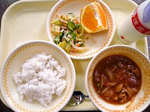 みなさん、進級おめでとうございます。今日は、今年度最初の給食です。給食では、色々な献立が登場します。好きなものだけではなく、苦手な物も出てくるかもしれませんが、少しでも苦手な物を減らしていきましょう!給食センターの栄養士や調理員も、みなさんのために心をこめて給食を作ります。今日のハヤシライスも、ご飯と一緒にもりもり食べて下さいね!
