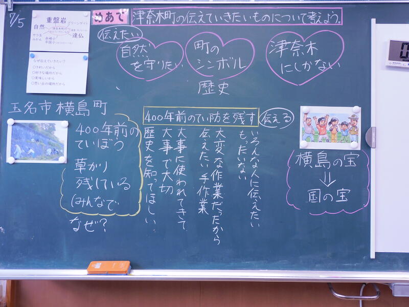 授業の最後には津奈木町にも残して伝えていきたいものはあるのか、どうして伝えていきたいのかを考え、意見を出し合いました。