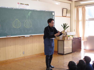 2月6日(金)に5年生が食文化の井上さんと川口さんをお迎えして、来年度のサラダ玉ねぎ販売に向けたアグリビジネスチャレンジの1回目の授業を行いました。