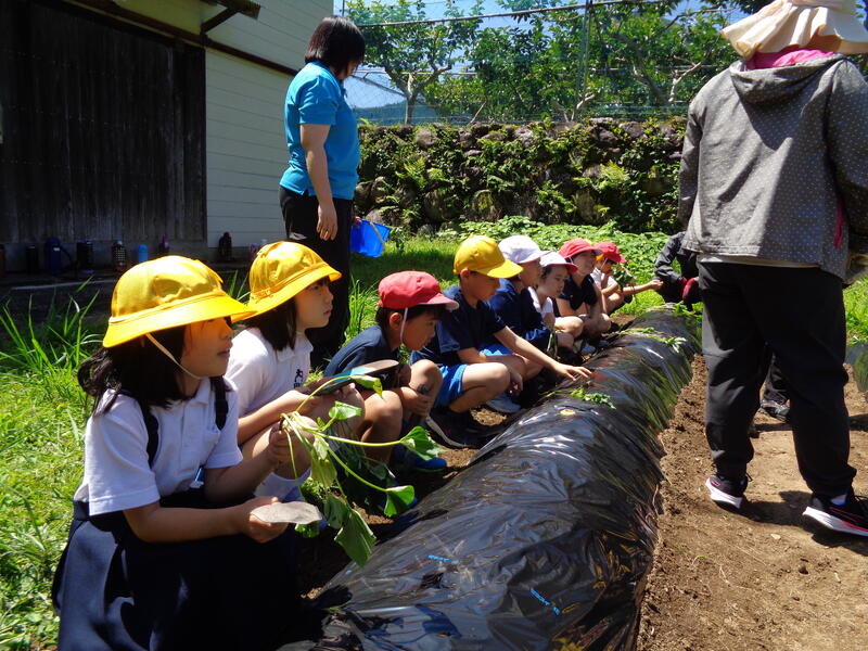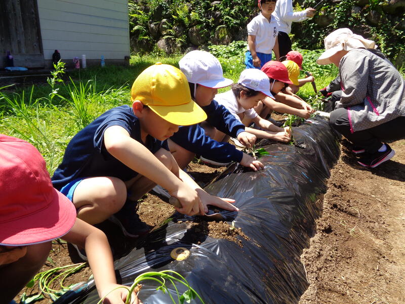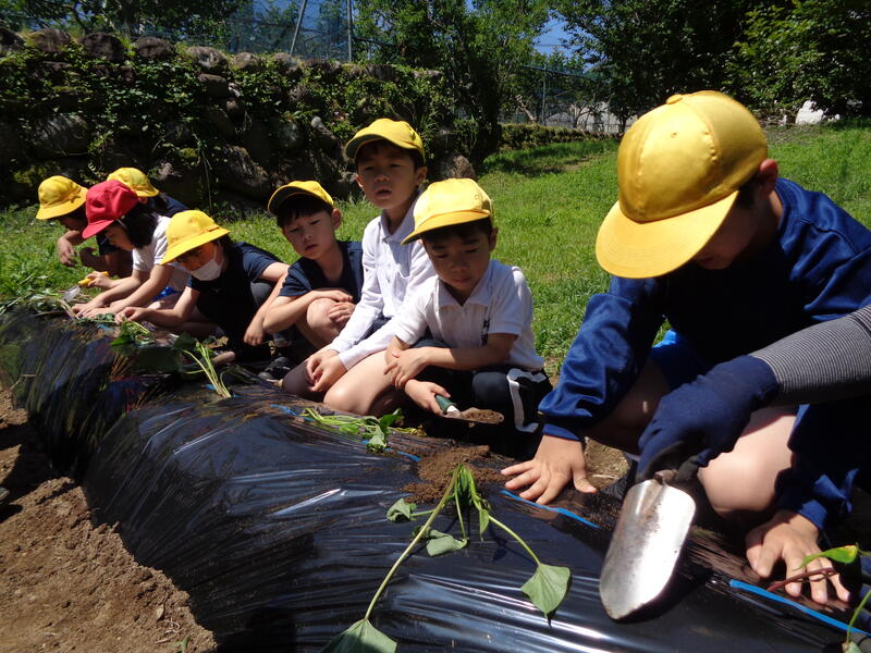 保護者の方々にご協力いただき、1~3年生が畑いっぱいにお芋の苗を植えました。
