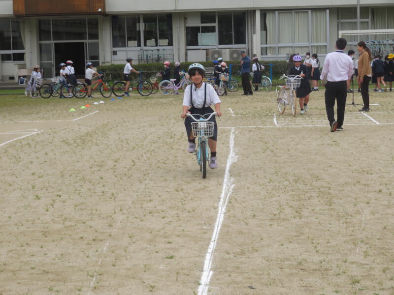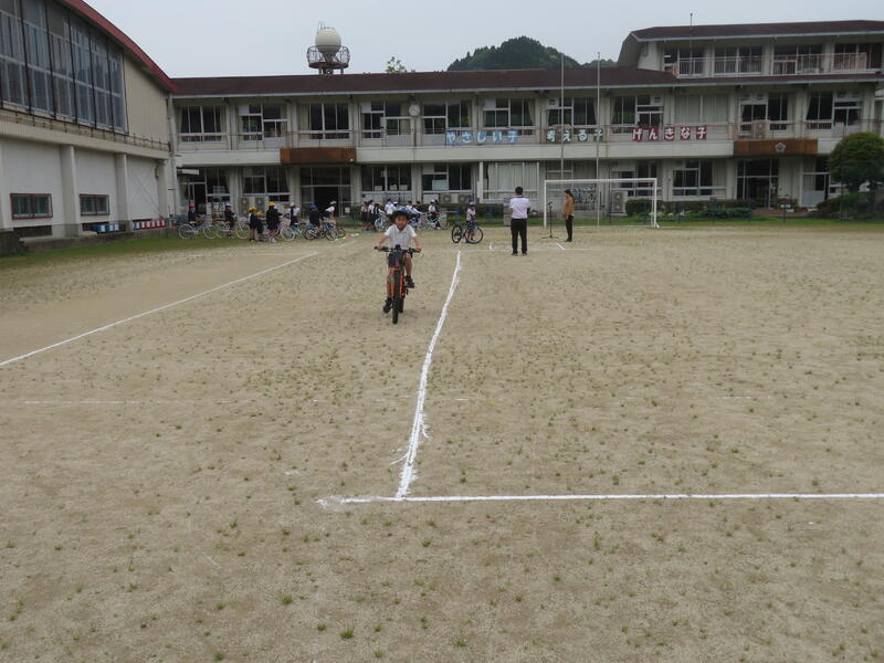 実際にコースを設定し、左側を走行したり、曲がり角や横断歩道の渡り方を確認したりしました。これからも、自転車に乗るときは、ヘルメットをかぶり、1列になって安全に乗りましょう。