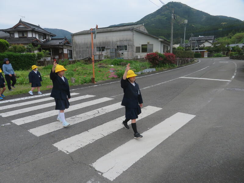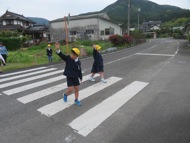 「右、左、右をよく見て、車が来ていないか確認してから」手を挙げて小横断歩道を渡りました。これからも、交通安全に気をつけて過ごしましょう。