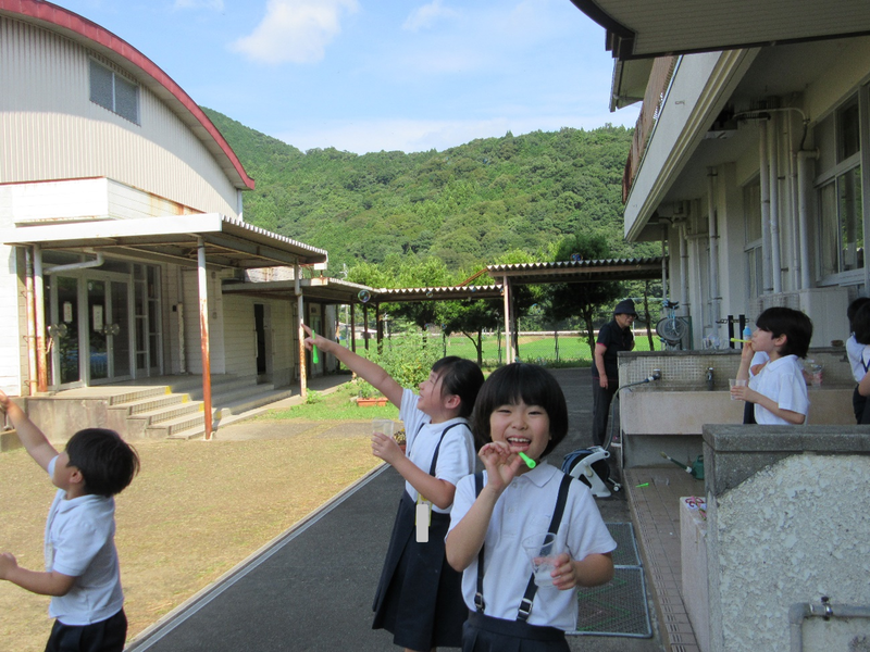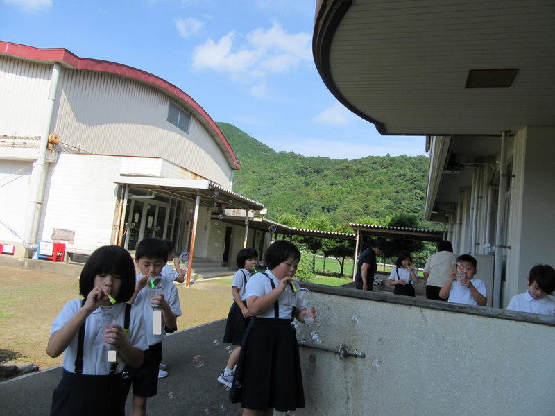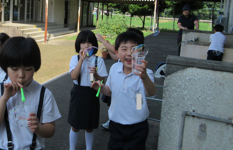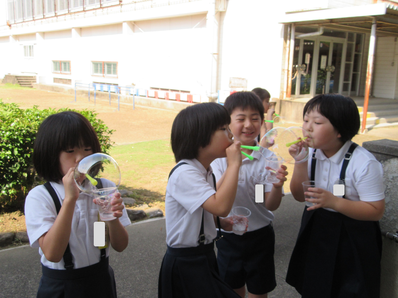 生活科で夏の遊びを体験しています。今日は朝から「シャボン玉」をしました。みんな思い思いにシャボン玉を飛ばして大はしゃぎでした。