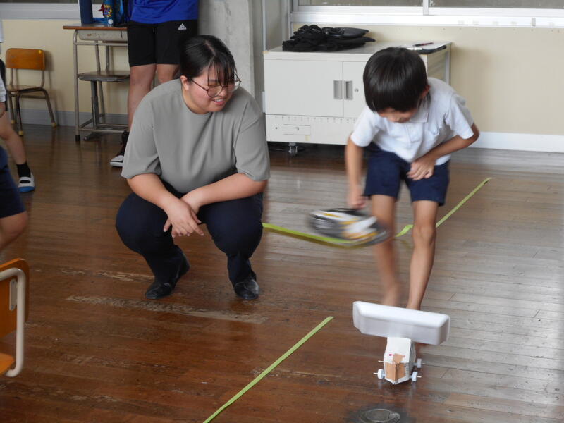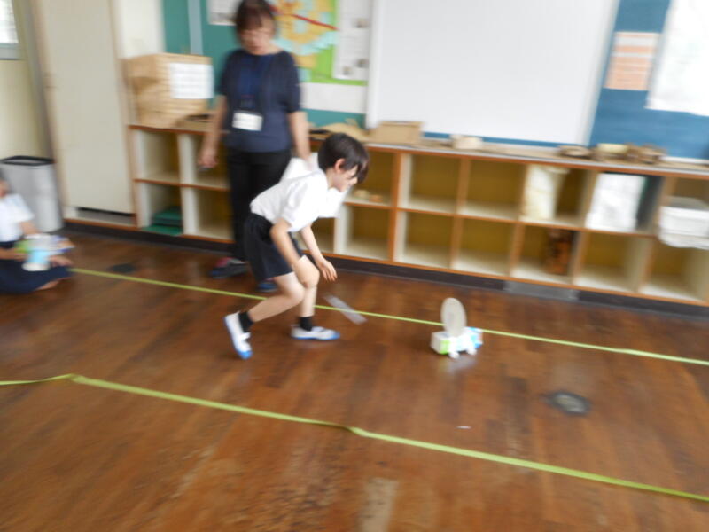 どこに風を当てたら、速く進むかをみんなで考えながら、工夫していました。