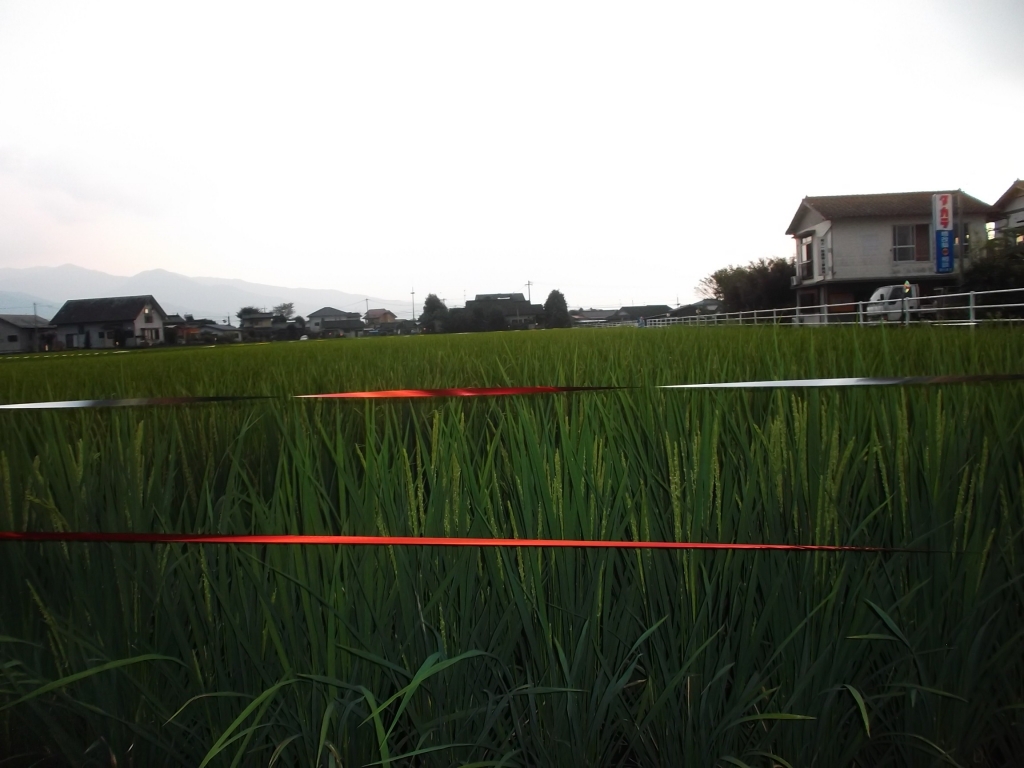 収穫前の水田にすずめよけのきらきらするテープがはってありまして。右の写真は「百太郎溝」です。