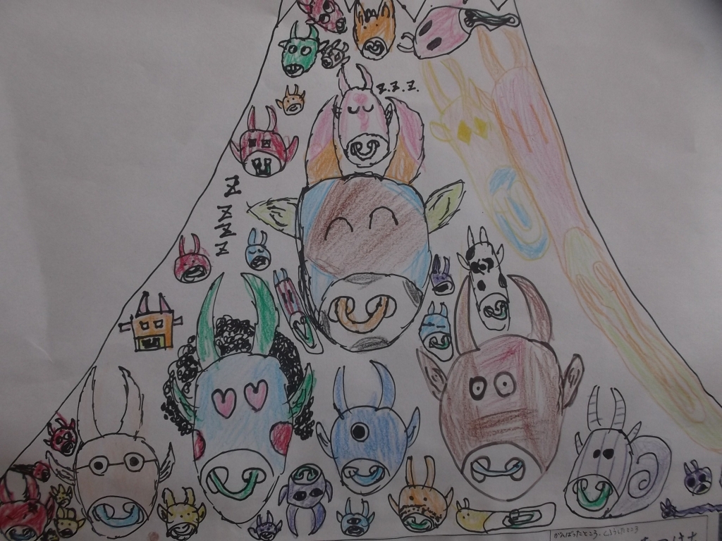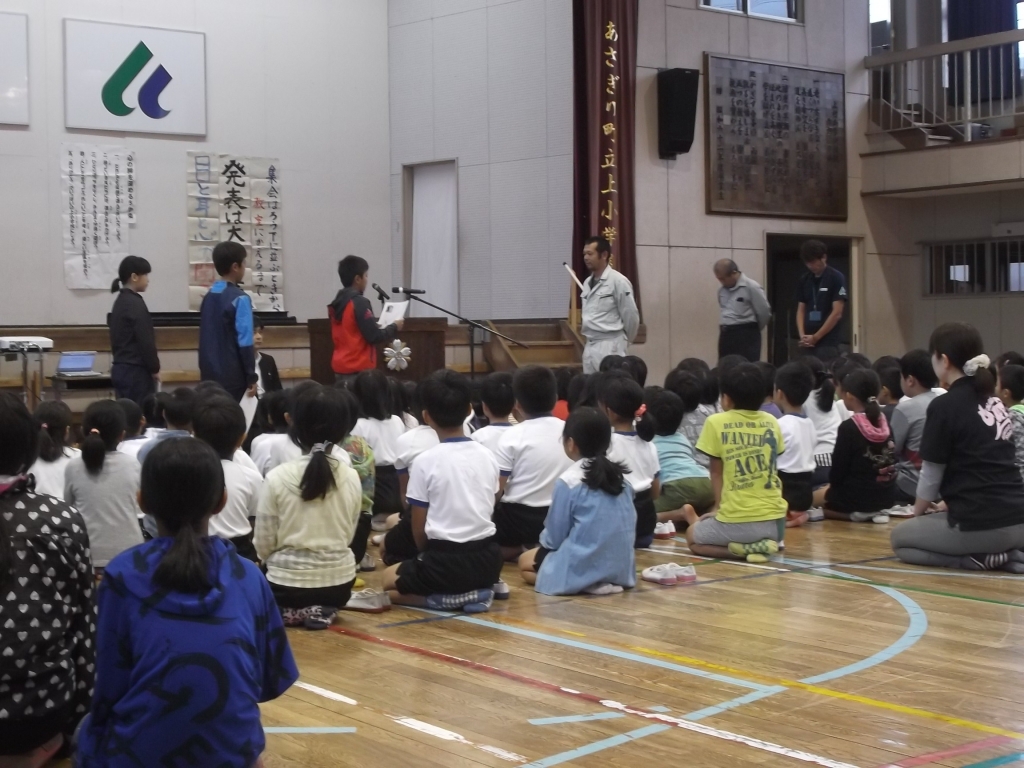 あたらしい給食コンテナ室建設にご尽力いただいた、工務店、設計事務所、教育委員会の方々をお招きして、全校児童で、感謝の意をあらわしました。