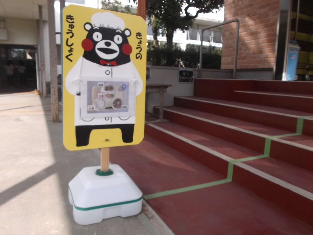 給食コンテナ室前にくまモンがお目見えしました。「今日のこんだて」を教えてくれます。