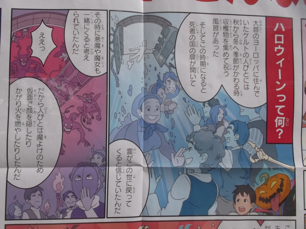明日は、ハロウィンです。ハロウィンに関する報道をよく目するようになりましたが、「ハロウィンというのはどんな意味があるか」をわかりやすく書いてあるものがありました。給食コンテナ室前にはってある「給食ニュース」という掲示物です。