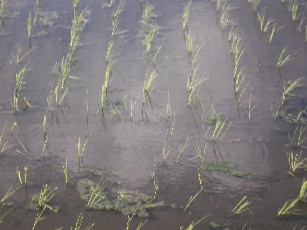 稲刈りが終わっていました。右の写真は田植えが終わってすぐの水田です。飼料用稲を植えてあるそうです。