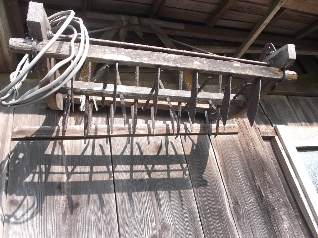 昔の農具が保管されていました。左が「たいち車」といい稲と稲の間の草取り用で、右が「まんが」といって牛に引かせて畑や田を耕していたそうです。