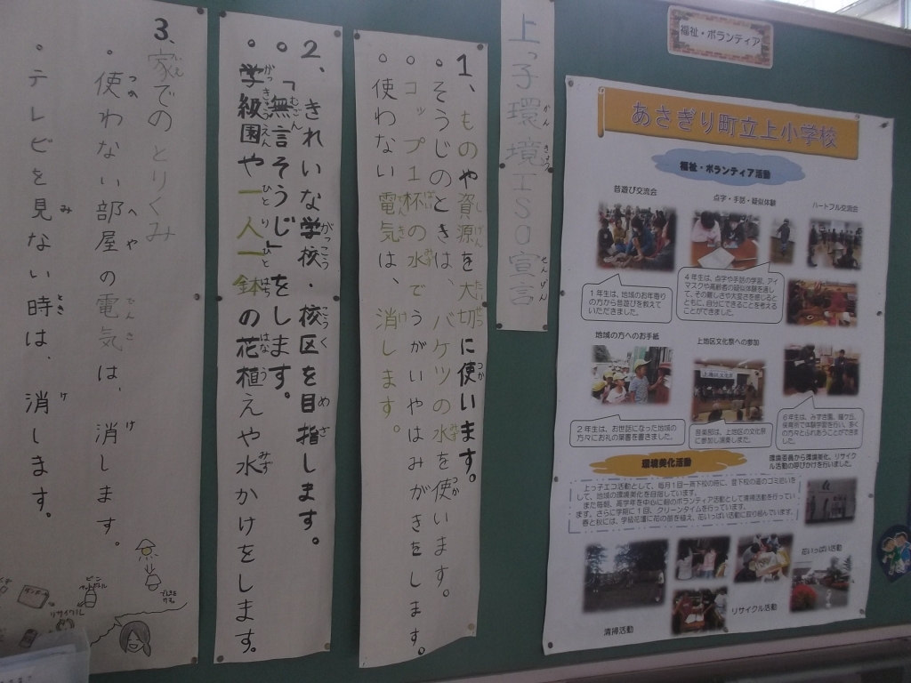 児童玄関前 「上小環境ISO」や「福祉・ボランティア」関係の掲示物があります。