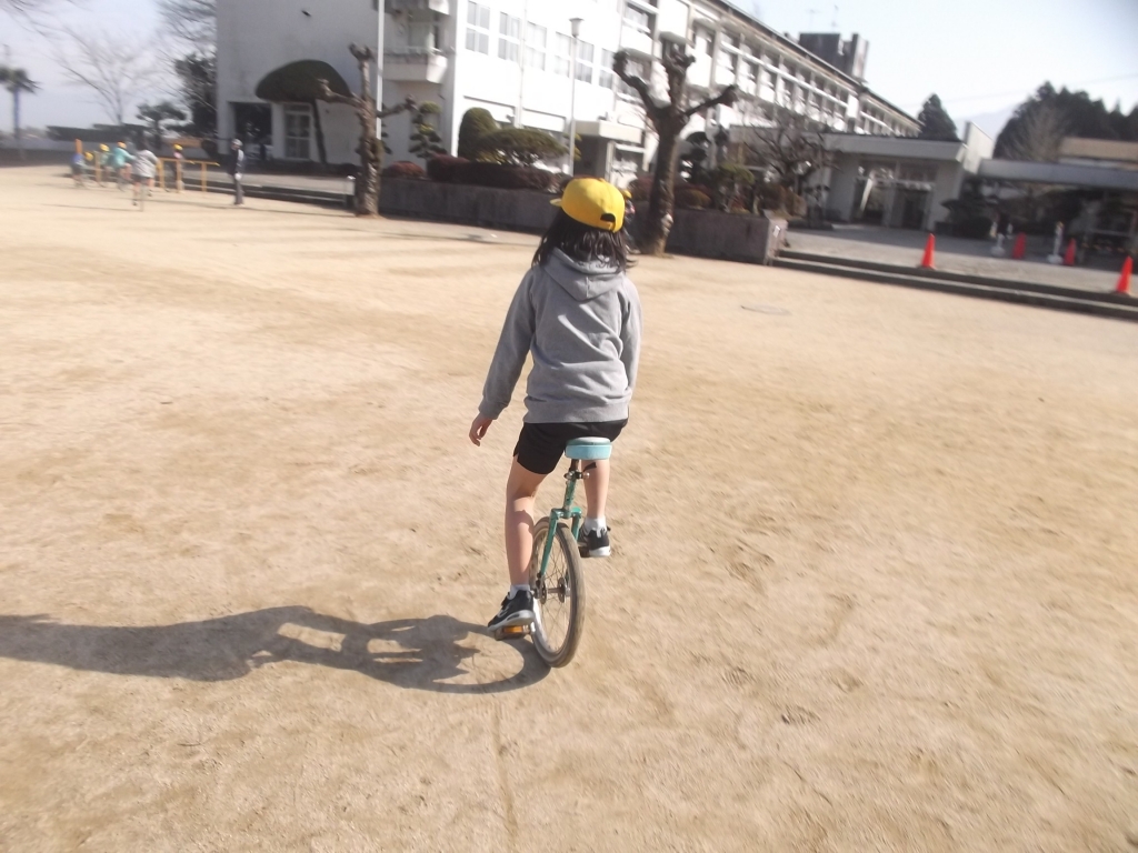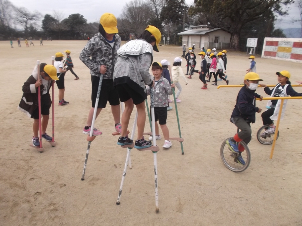 昼休みの一コマ バレーボール、一輪車、竹馬あそびをしています。
