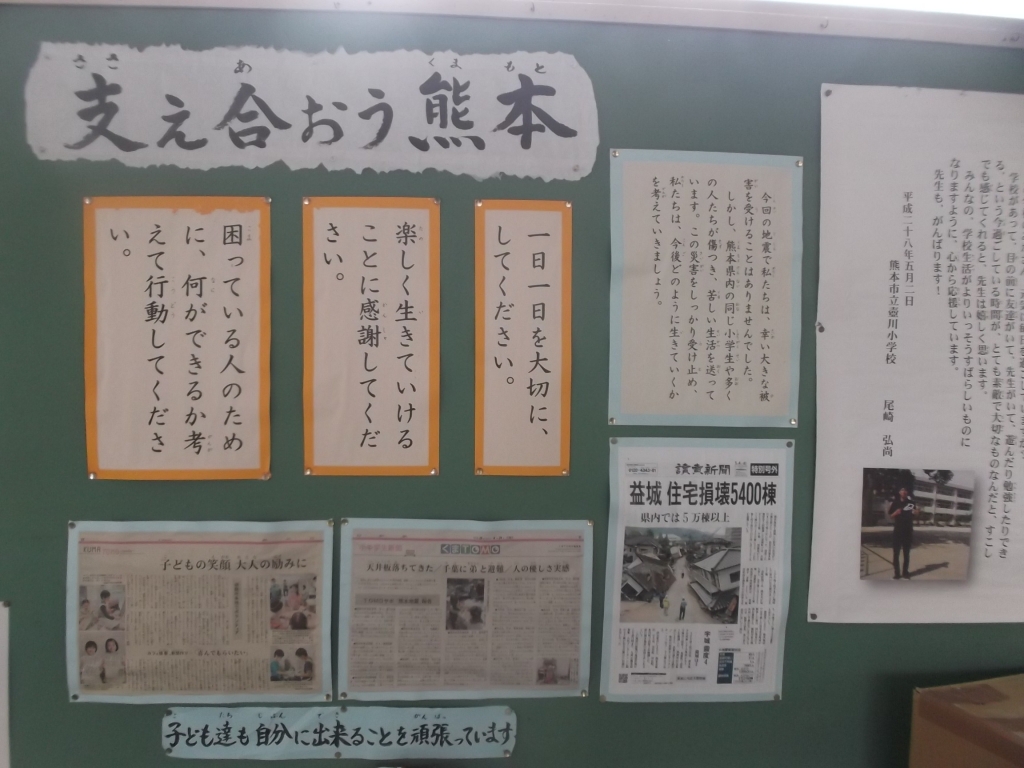 児童玄関から入って正面の掲示板です。熊本地震のコーナーになっています。