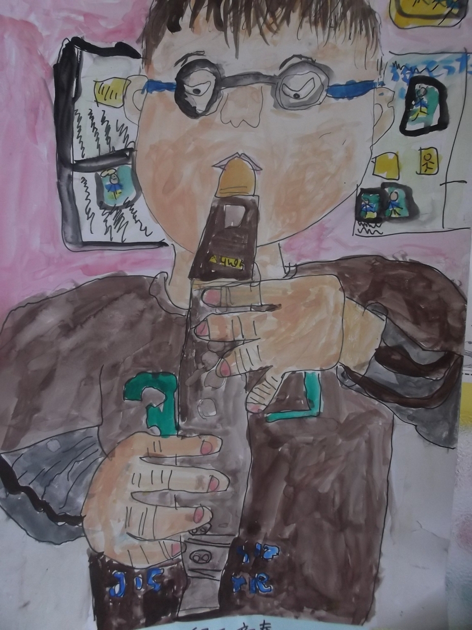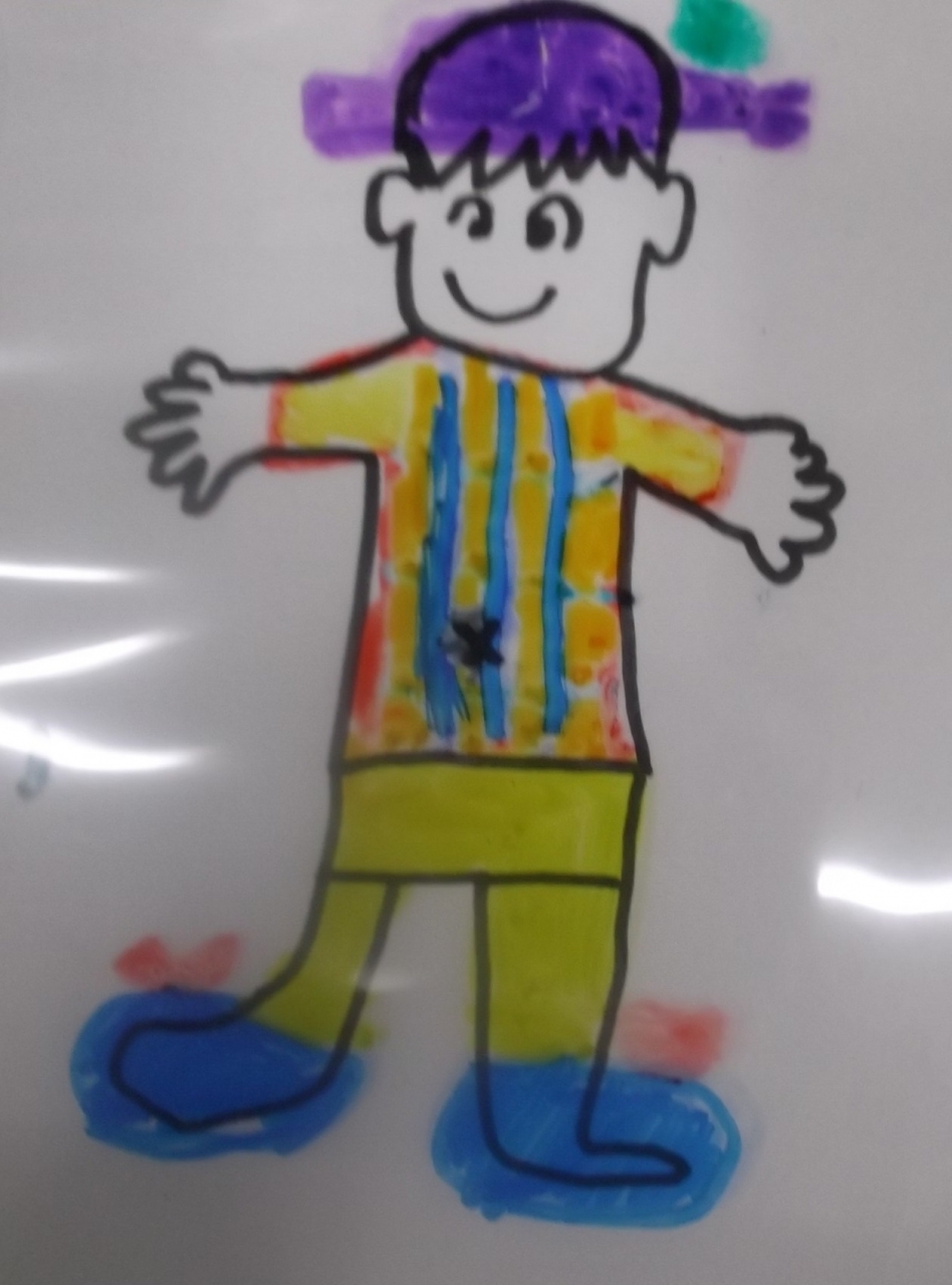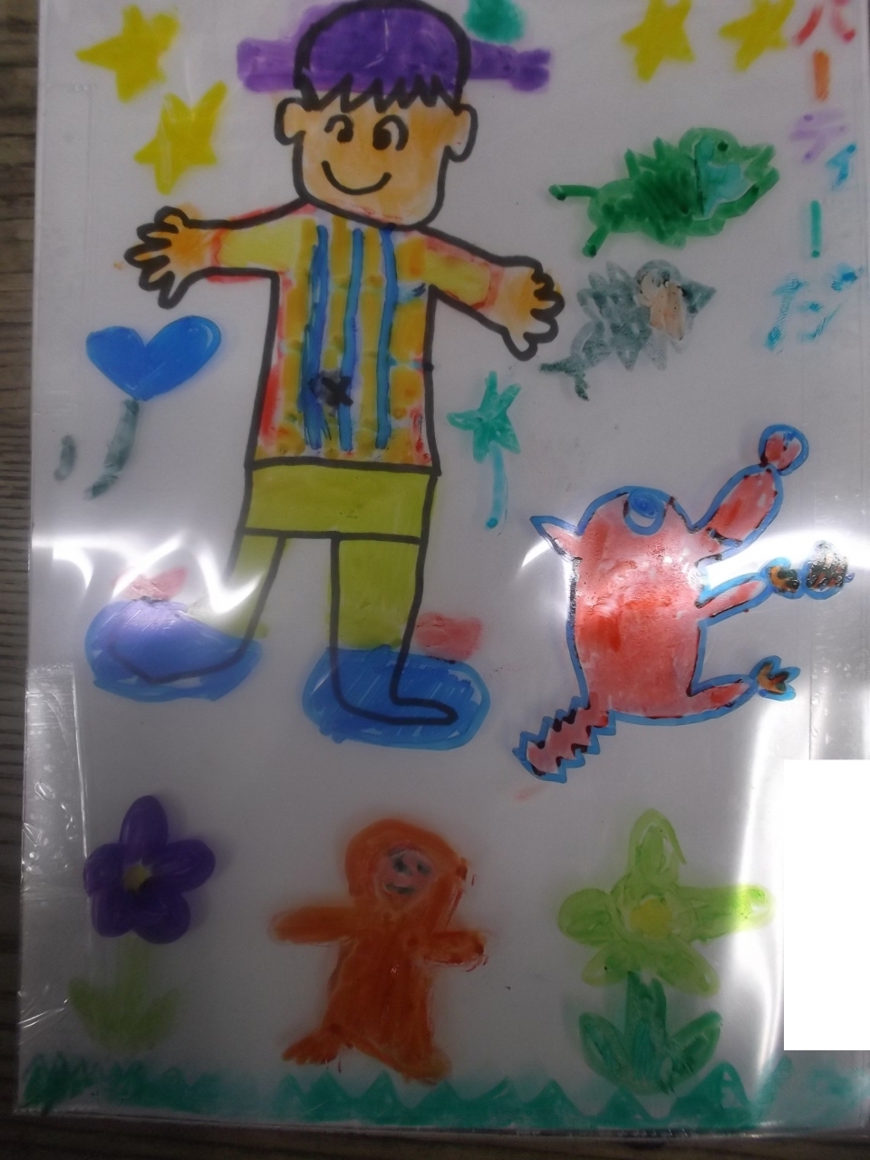 真ん中の画用紙に絵を描きます。左右に透明のシートをはり、色マジックで描きそれを順番に真ん中の画用紙の絵に重ねていくと、最後の絵のような変身した絵が出来上がります。