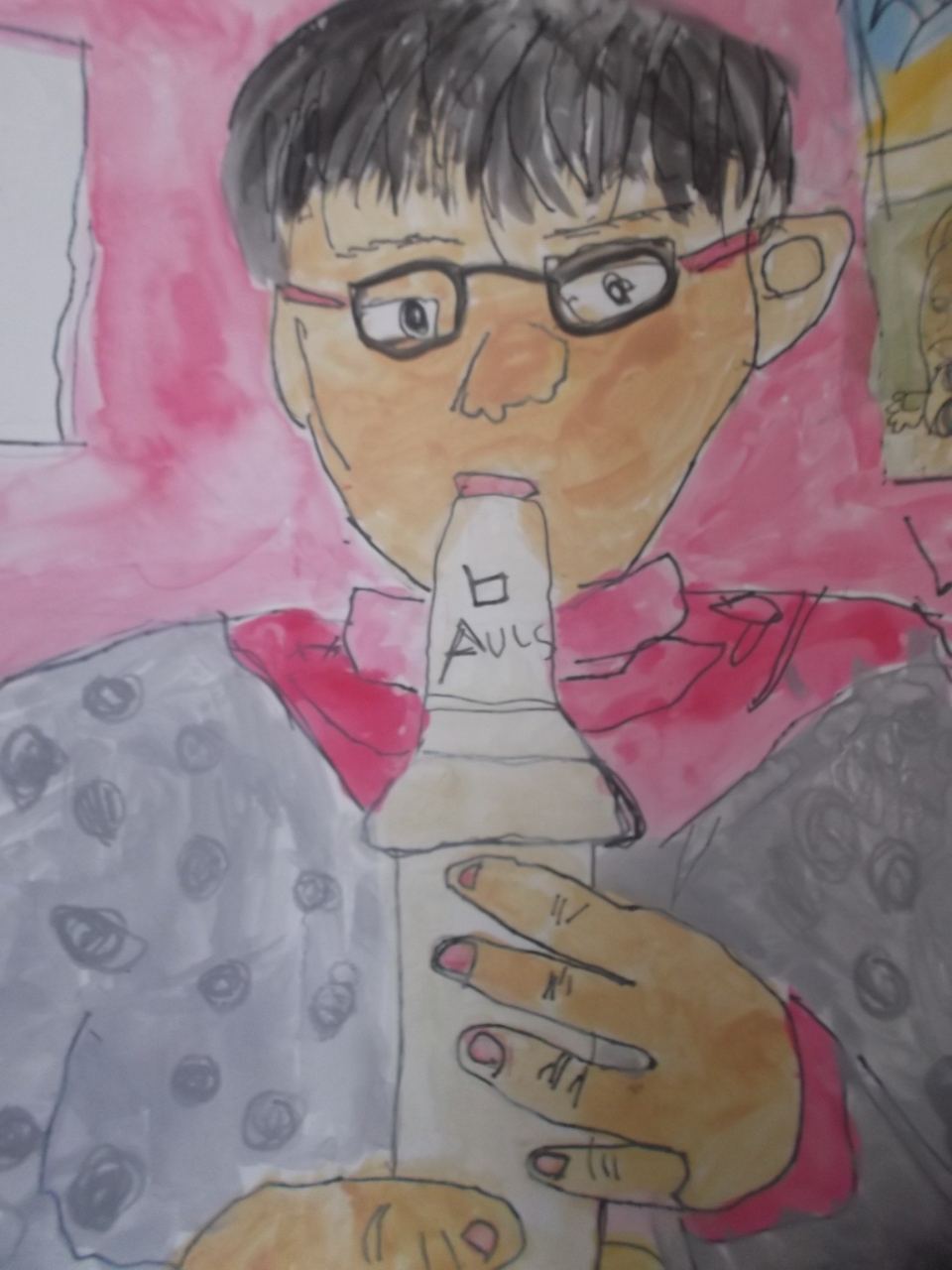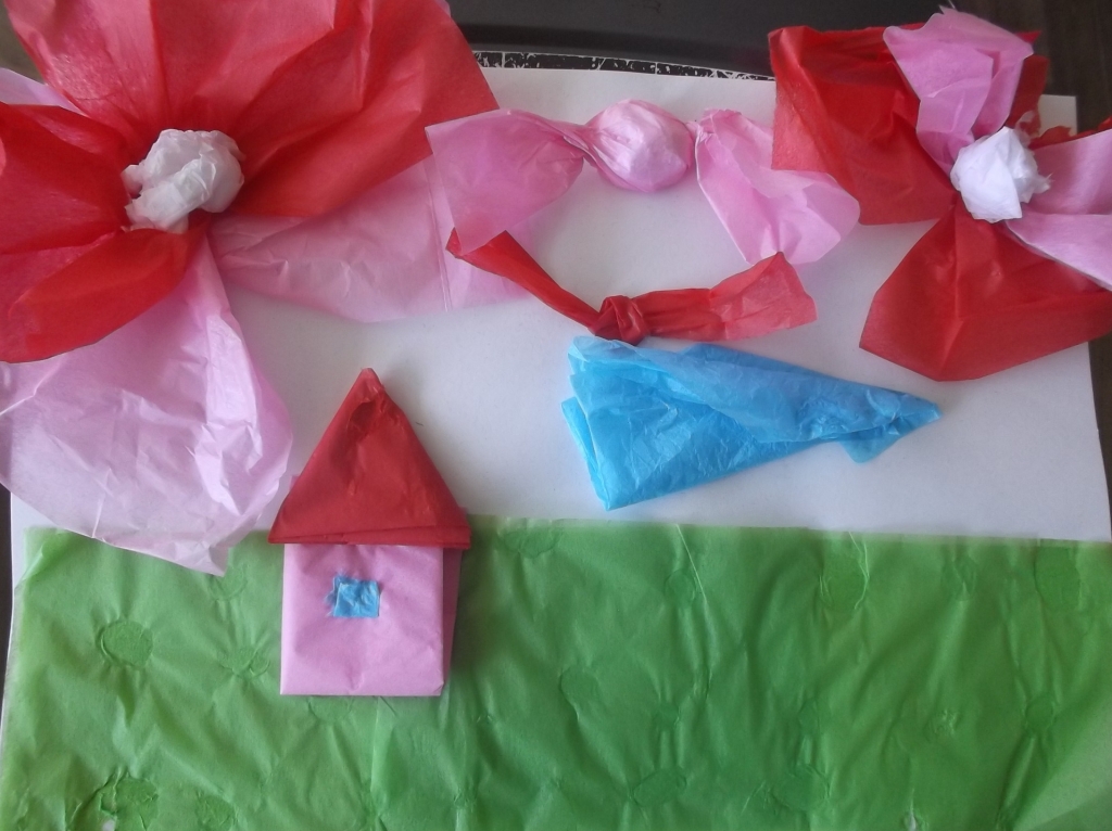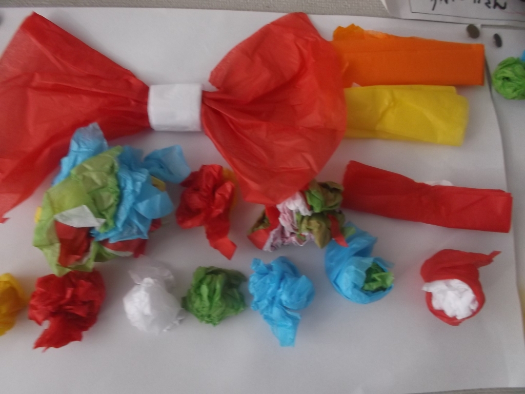 真ん中の画用紙に絵を描きます。左右に透明のシートをはり、色マジックで描きそれを順番に真ん中の画用紙の絵に重ねていくと、最後の絵のような変身した絵が出来上がります。
