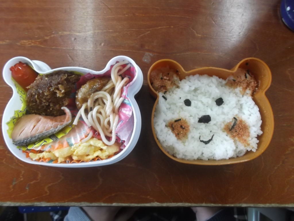 5年生のお弁当です。入れ物が動物の顔の形で、目や鼻がついてかわいいお弁当でした。
