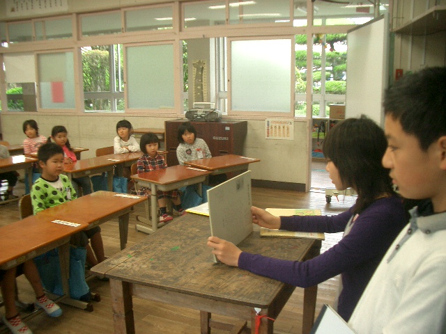 4月12日から、朝自習の時間に6年生が1年生に教室で読みきかせをしています。「孫悟空」などの紙しばいをしています。 子ども