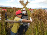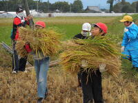 保護者の方々とJA青壮年部の方々のご協力をお願いして行いました。初めての体験の児童もいて、とても貴重な体験となりました。一人一人が積極的に動き、あっという間に竿掛けまで終わってしまいました。たくさんのお米が獲れたことと思います!ご協力をしていただいた方々大変お世話になりました。