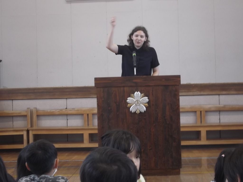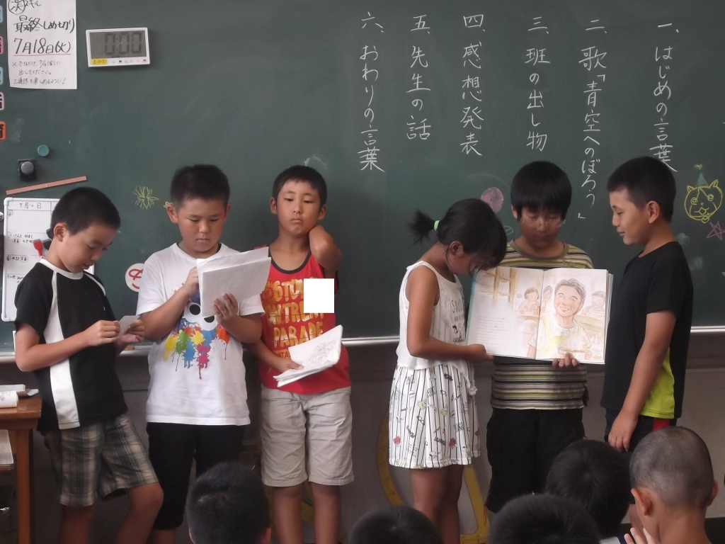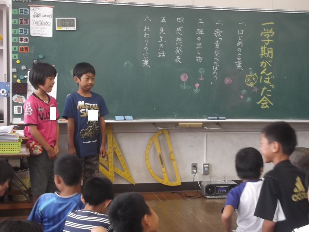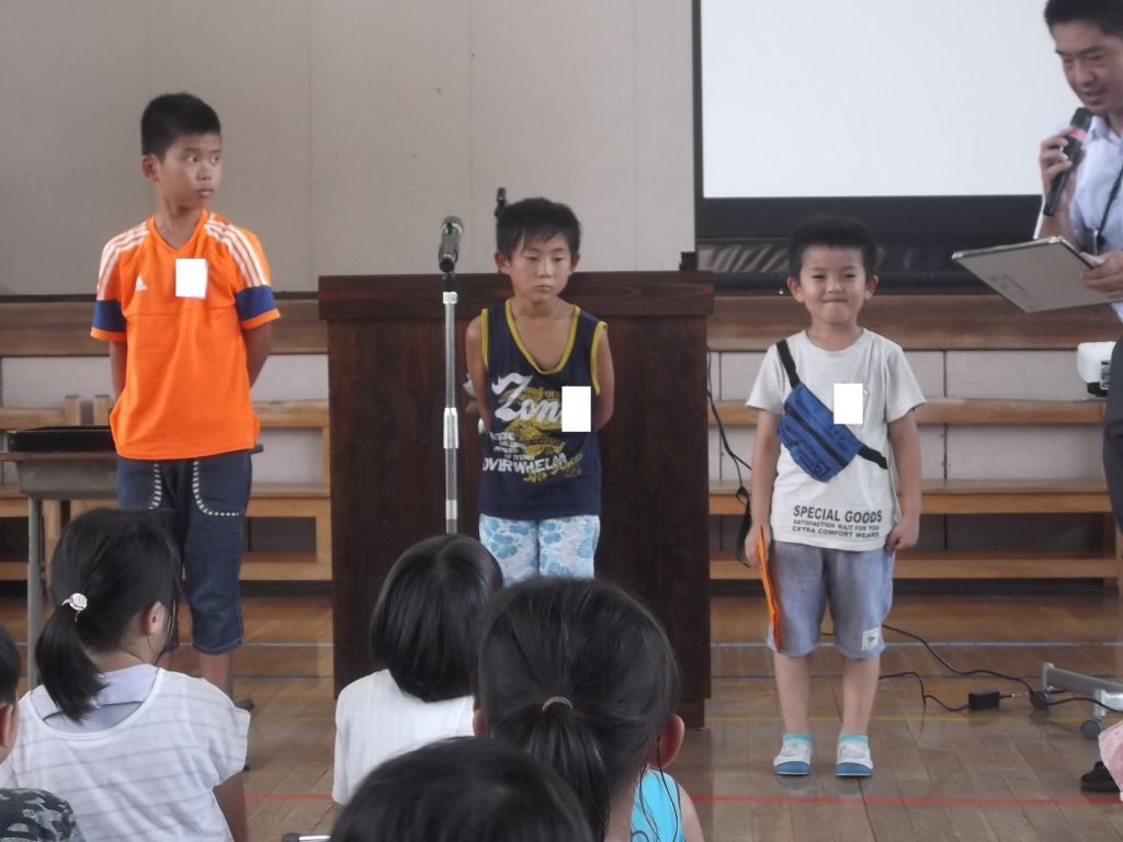 終業式 児童発表の3人 今回は、1,4,6年生の代