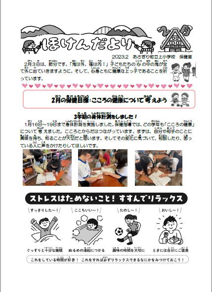 ほけんだより2月号を発行しました。暦の上では春を迎えていますが、まだまだ寒い日が続きます。体も心も元気に、残り2か月頑張りましょう!!2月.pdf