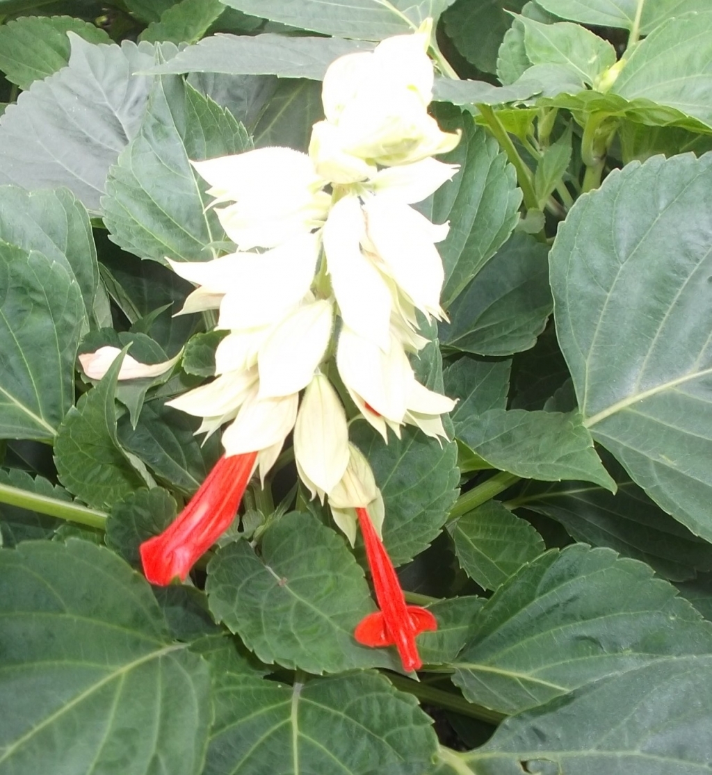学校には、夏の花の代表「サルビア」が植えてあります。最近、花がさき始めました。サルビアというと赤い花を思いだしますが、なんと白い花の中から赤い花が出ているサルビアを見つけました。サルビアのいろいろな品種の中でも「トーチ」とよばれているものだそうです。