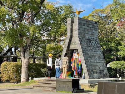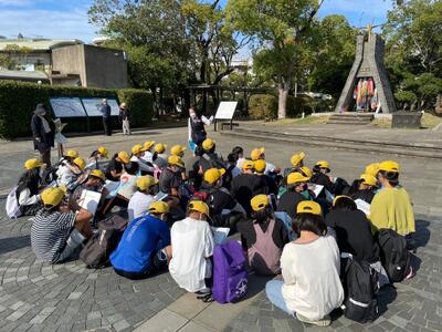 昼食を終えた後は、フィールドワークです。長崎市内を歩きながら、戦争や平和について学習を重ねています。平和式典では、心を込めて折った千羽鶴を奉献しました。