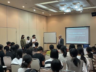宿泊先である矢太樓にて、語り部の三瀬さんより、貴重な当時の経験についてお話しいただきました。改めて、平和であることの尊さ、命はとてもかけがえのないものであることを再確認できました。一人一人とても真剣に話を聞く姿がありました。