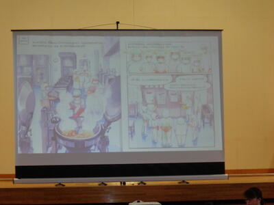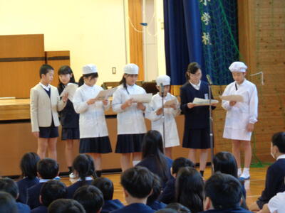 その一環として、給食委員会が給食センターの一日の様子を説明してくれました。