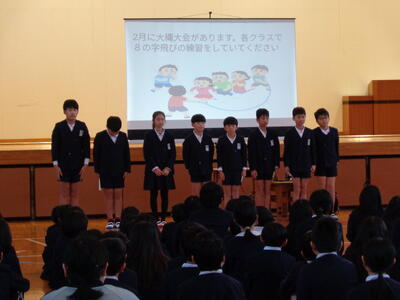 6年生代表児童が、「3学期にがんばりたいこと」を発表してくれました。6年生にとっては小学校生活最後の学期です。「卒業」という大きな目標に向かって、みんなで心を一つにがんばってほしいです。