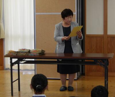 今日も朝から絵本を読み聞かせる声が、あちこちから聞こえてきました。くいいるように絵本を見ている子どもたちの姿が印象的でした。1年生の教室では、1冊読み終わられた途端、「あ~おもしろかった!」と思わず声を上げた子もいましたよ。