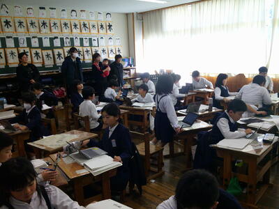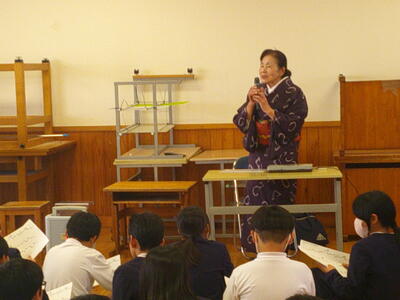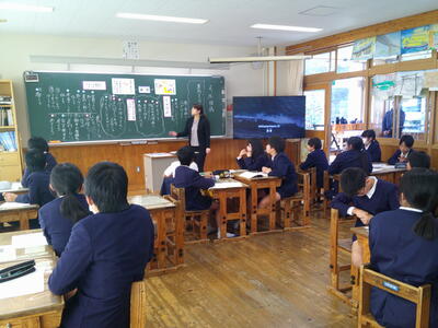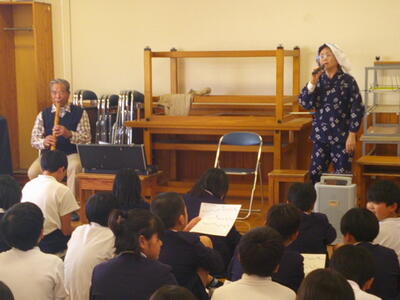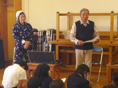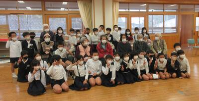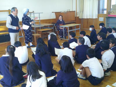 12/22 5年生の音楽で「日本の民謡」について学習します。自分たちの地域にも「牛深ハイヤ節」や「魚貫草刈り歌」という民謡があるので、講師の先生(福本さん、岩﨑さん)に来ていただいて、「魚貫草刈り歌」を教えていただきました。給食の時間によく流れている歌なので、子どもたちも耳なじみがあってすぐに1番の歌が歌えるようになりました。先生方も「素晴らしい!」とほめてくださいました。