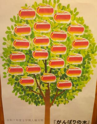 〈がんばりの木 作成〉クラスのみんなががんばっていることを見つけて、木の実を増やしています。