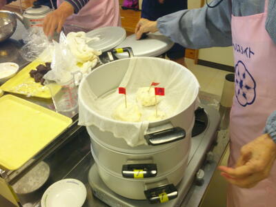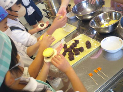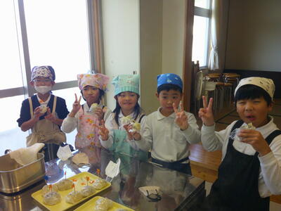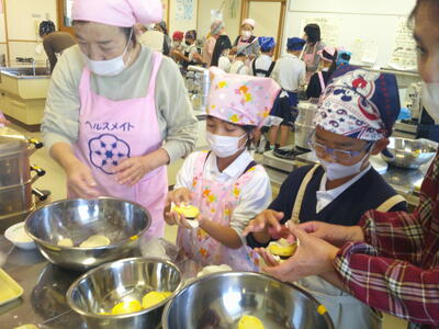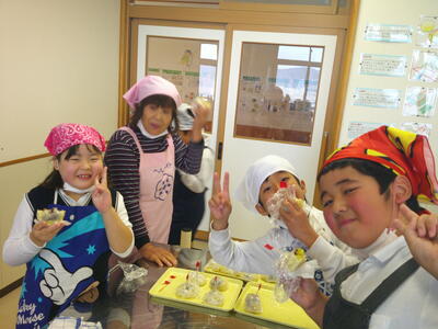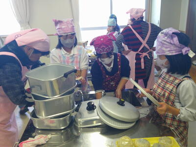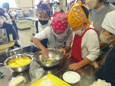 講師として、牛深地区食生活改善推進員のみなさんをお迎えし、材料や作り方のレクチャーを受けた後、早速調理を開始しました。初めはおそるおそる触っている感じでしたが、2個目をつくるときはすっかり慣れて手際よくつくることができました。できたてのいきなり団子はほかほかで、お芋もあんこも甘くてとてもおいしかったです。初めて食べたという子がいて、「どうだった?」と聞くと、「おいしかった!」と喜んでいました。