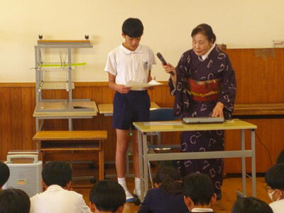 また、5年生の国語では、漢詩について学ぶ授業があります。そこで、地域で詩吟を教えていらっしゃる田中さんに来ていただいて、「偶成」(朱熹)という漢詩を吟じてみました。