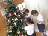 子どもたちのアイデアを取り入れた牛乳パックを使ったプレゼントの飾り、紙コップを使ったサンタクロースとトナカイの飾りを作り、大きなもみの木に飾りました。