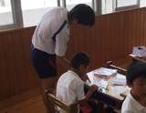 1年生の授業では、子どもの横について学習のアドバイスをしたり、体育で