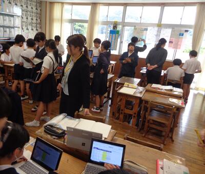 平野指導主事からは、本校の研究について、ICTの活用について、国語科の授業づくりについてご指導いただきました。特に「教師は、柔軟な対応力が必要で、ガイド役に徹するべきである。児童の資質・能力を育てるには、一人一人がどのような言葉の学びをしているのかを見取り、適切にフィードバックすることが大切」というお話が心に響きました。私たち教師の授業力の向上という点でも大変有意義な研修となりました。6年生もよく頑張りました!