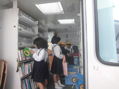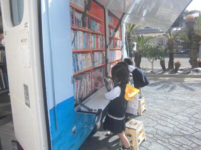 今年度から,1,2年生のみ試験的に移動図書館「いるか号」で本の貸し借りをやってみることにしています。